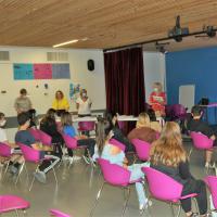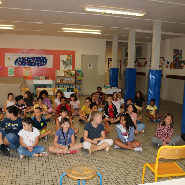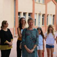 à sa gauche, MMe l'Inspectrice de secteur ; Mme Alsina, Directrice de l’école, la deuxième adulte à partir de la gauche.