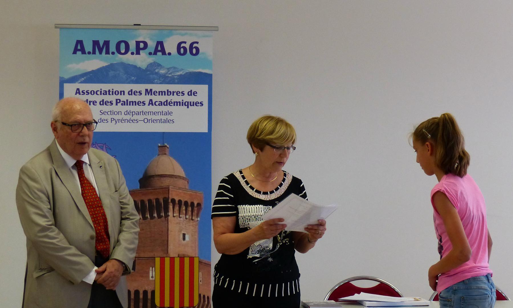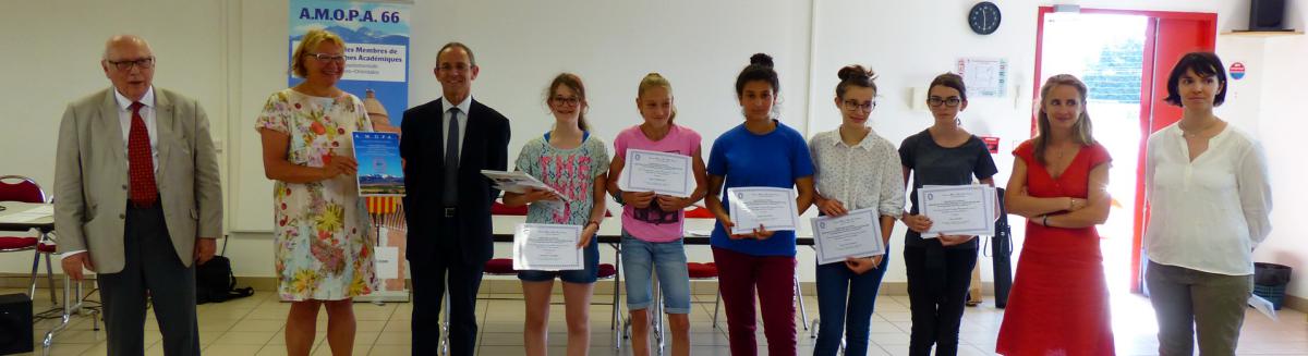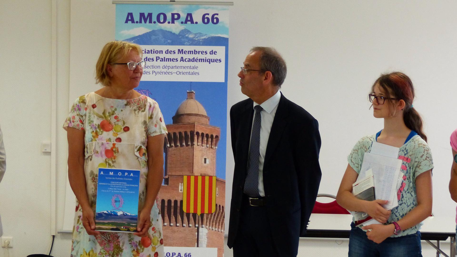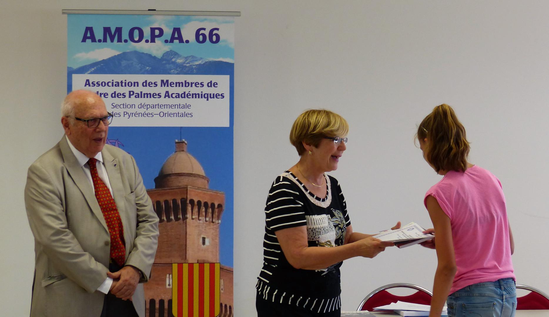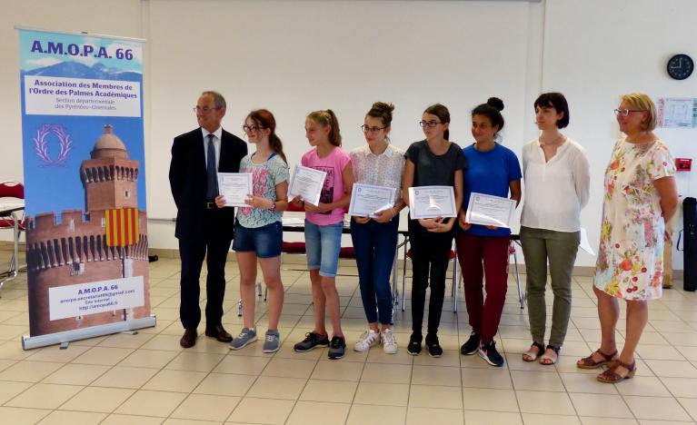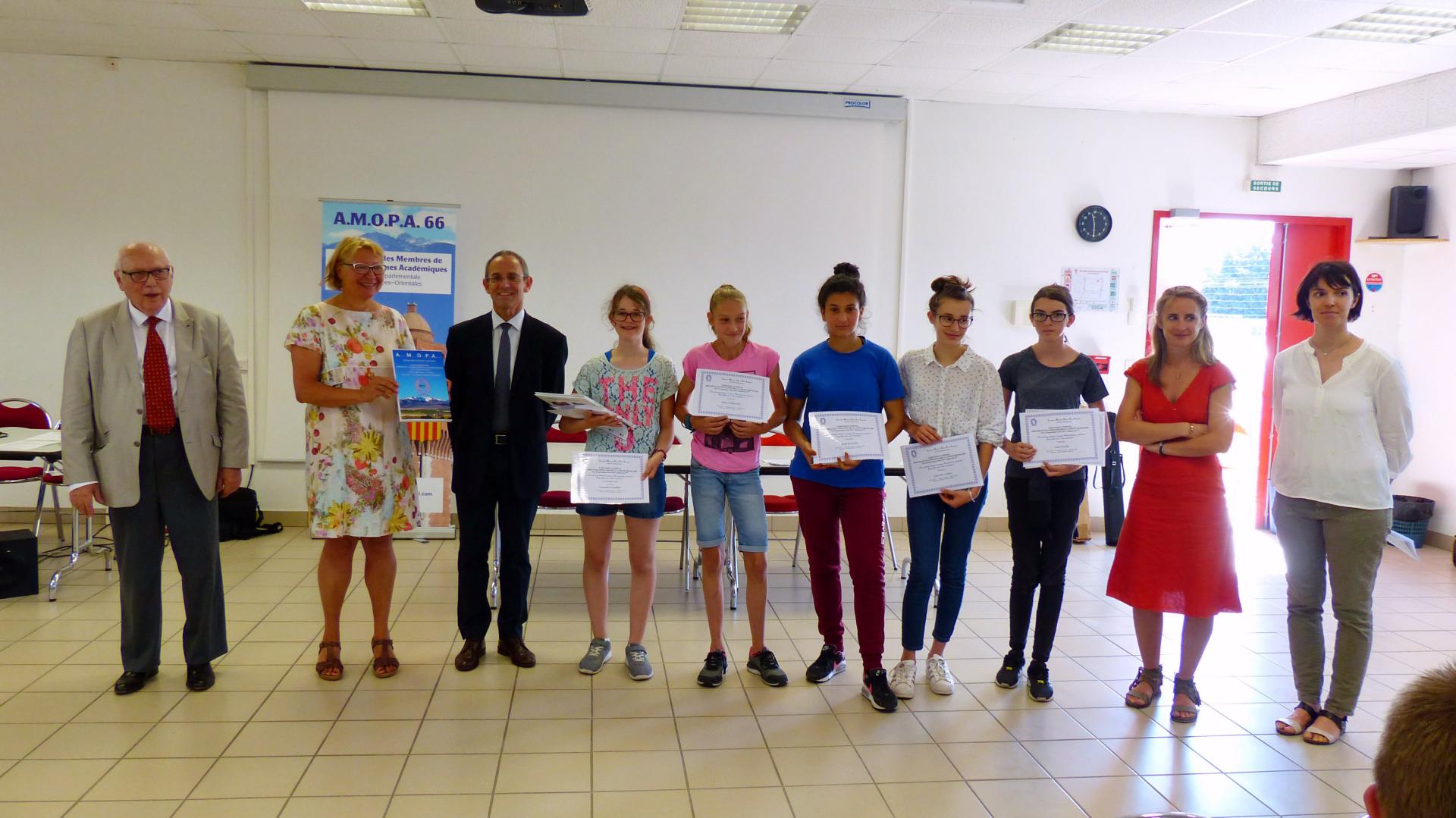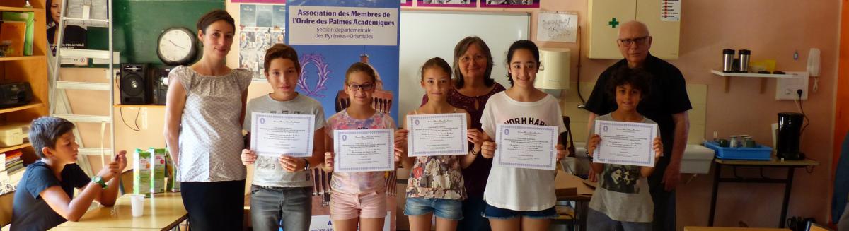 Les membres du bureau de la section départementale de l’Association des membres de l’Ordre des Palmes Académiques se sont rendus le mardi 20 juin 2017 à l’école élémentaire Pablo Picasso de Céret pour remettre aux élèves de la classe de CM1-CM2 de Mesdames Yannick Mas, directrice et Chloé Mozzo, professeurs des écoles, les diplômes pour leur participation au concours d’expression française organisé nationalement par l’AMOPA dans le cadre de la défense et illustration de la langue française.
