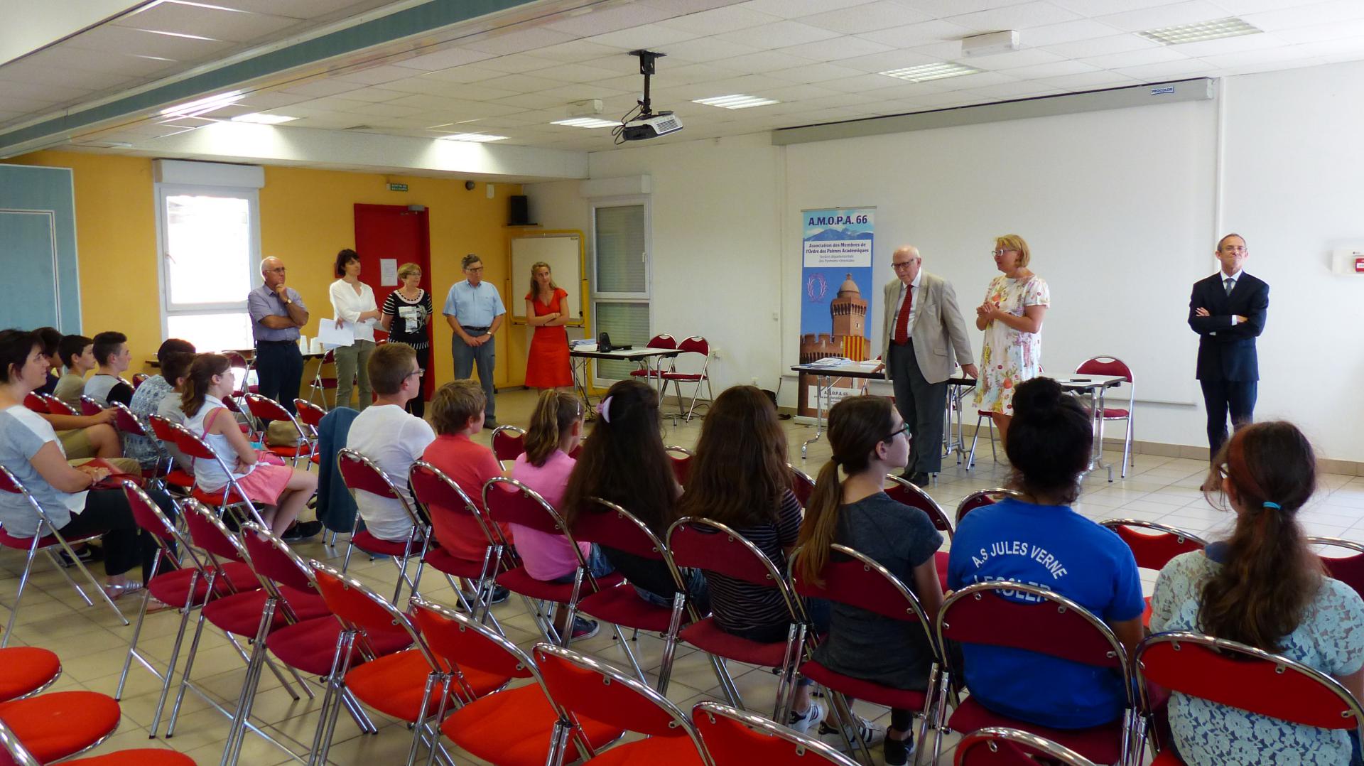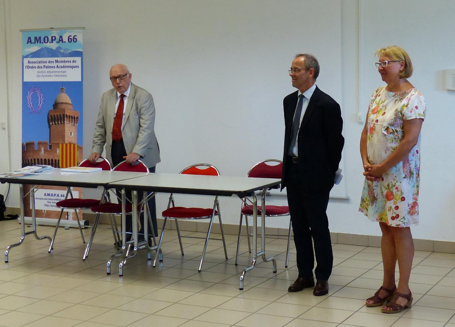 Les officiels : M. Robert Lopez, président AMOPA 66 ; Mme Juliette Tello, principal du collège ; M. Michel Rouquette, inspecteur d'acxadémie - DASEN