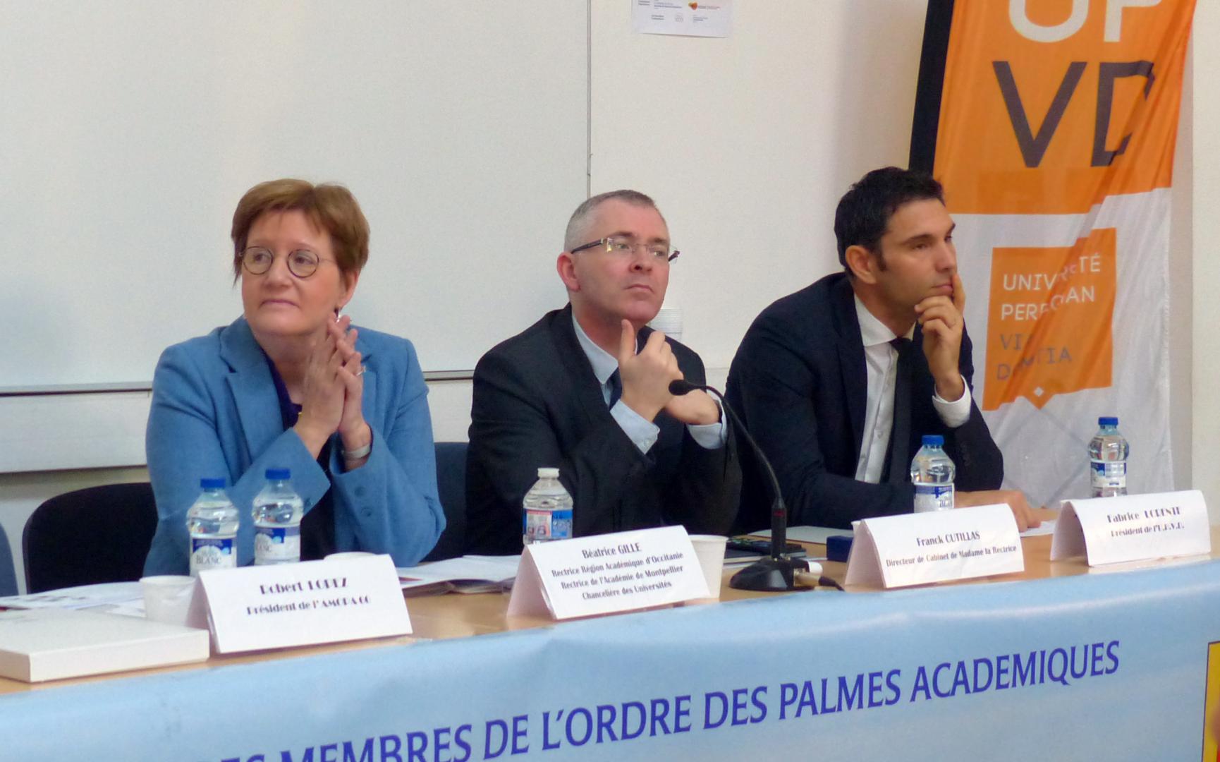 Après une présentation des membres du bureau de la section des P.O. des Palmes Académiques (AMOPA 66), le président M. Robert Lopez , a rappelé l'évolution des palmes académiques et le sens qu'il fallait donner à cette cérémonie. Mme la Rectrice a assisté à l’intégralité de la manifestation au cours de laquelle, elle a procédé personnellement à trois décorations dont celle de M. Fabrice Lorente, Président de l'Université de Perpignan.