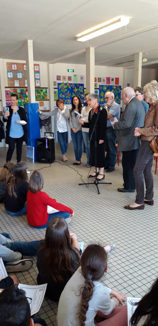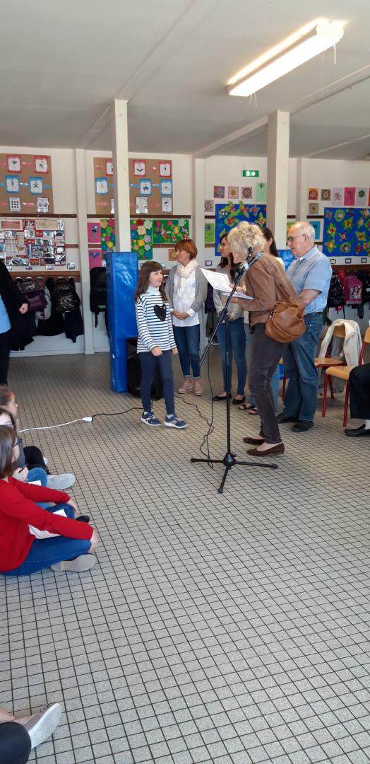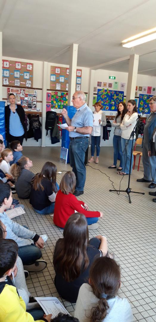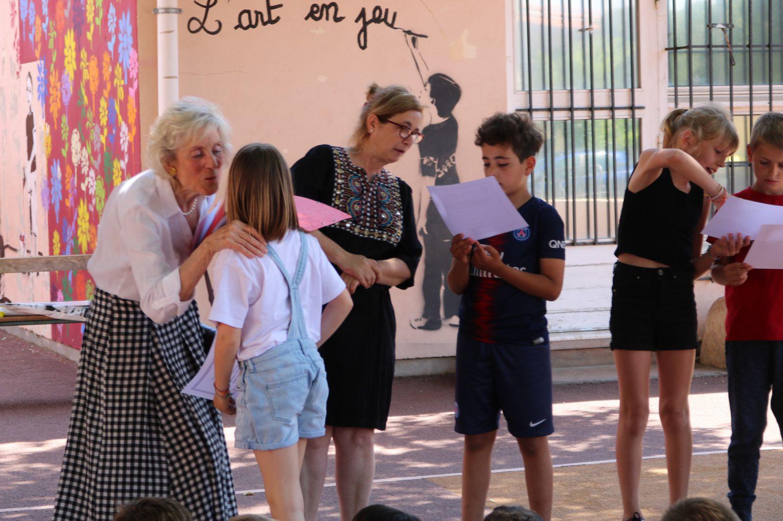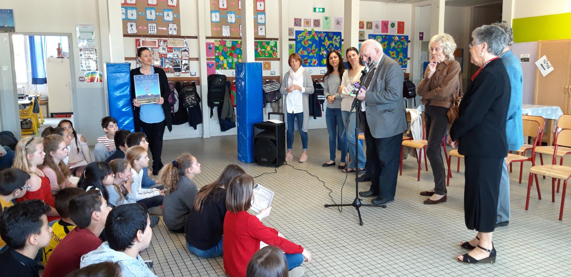 L’AMOPA remet deux tableaux-hommages à Monsieur Beauvoir et à sa classe, et à Madame Giamarchi, ainsi que deux livres pour la classe.