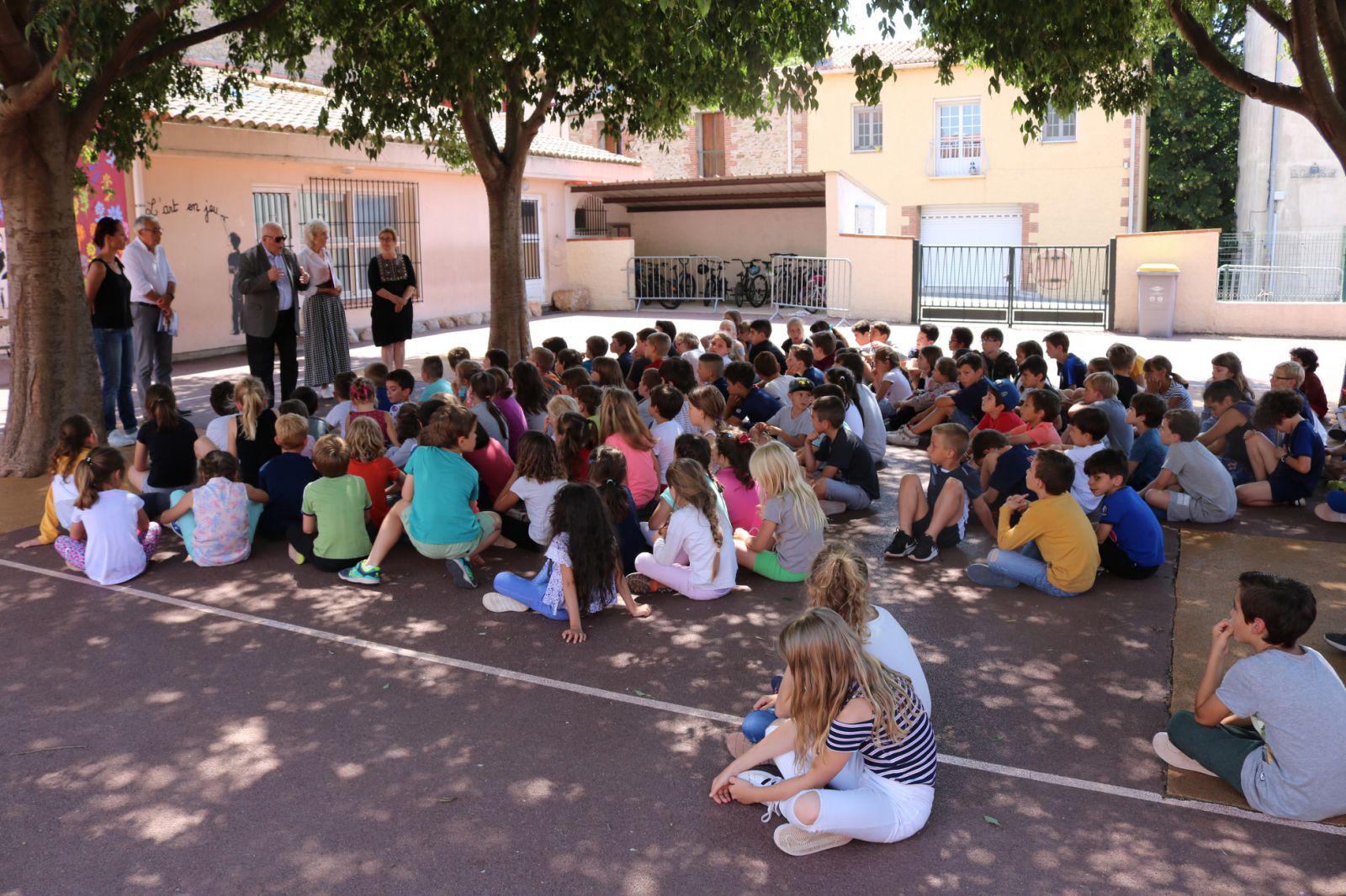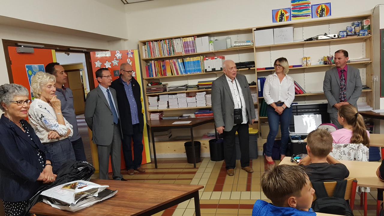 Au fond, de gauche à droite : Mme Lehoux, professeur; M. Porteix, Maire de Sorède; M. Lopez, président AMOPA 66; Mme Ruget, AMOPA ; Mme Alsina, Directrice de l’école.