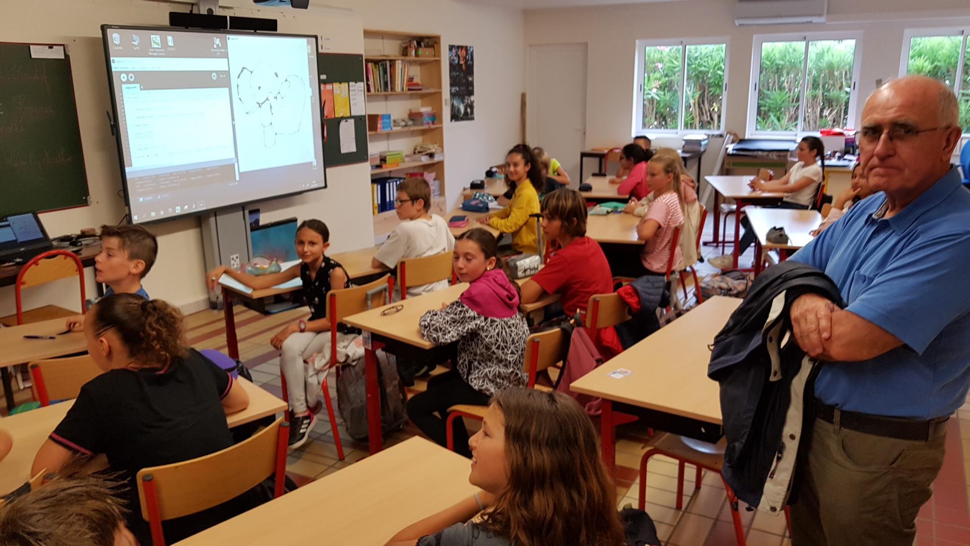 Monsieur Robert Lopez, président de l’AMOPA66, se joint à lui après avoir rappelé la mission de cette association, composée d’anciens enseignants qui souhaitent proposer des projets pout aider l’Education Nationale. Madame Giamarchi, professeur ressource pour l’utilisation du numérique, présente le travail réalisé : les élèves ont découvert un langage de haut niveau et ont pu faire évoluer un programme pour produire des images numériques personnelles, belles et très variées.