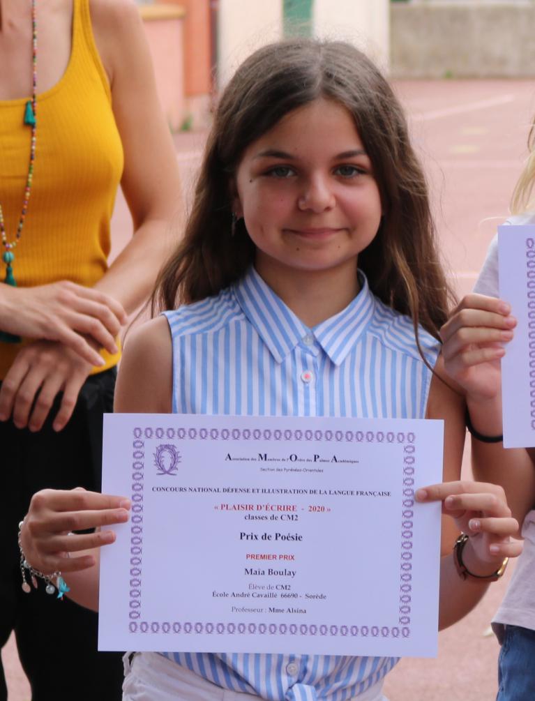 un deuxième prix national de poésie pour Maïa Boulay élève de CM2 dans la classe de Madame Alsina pour le poème « J'attends ».