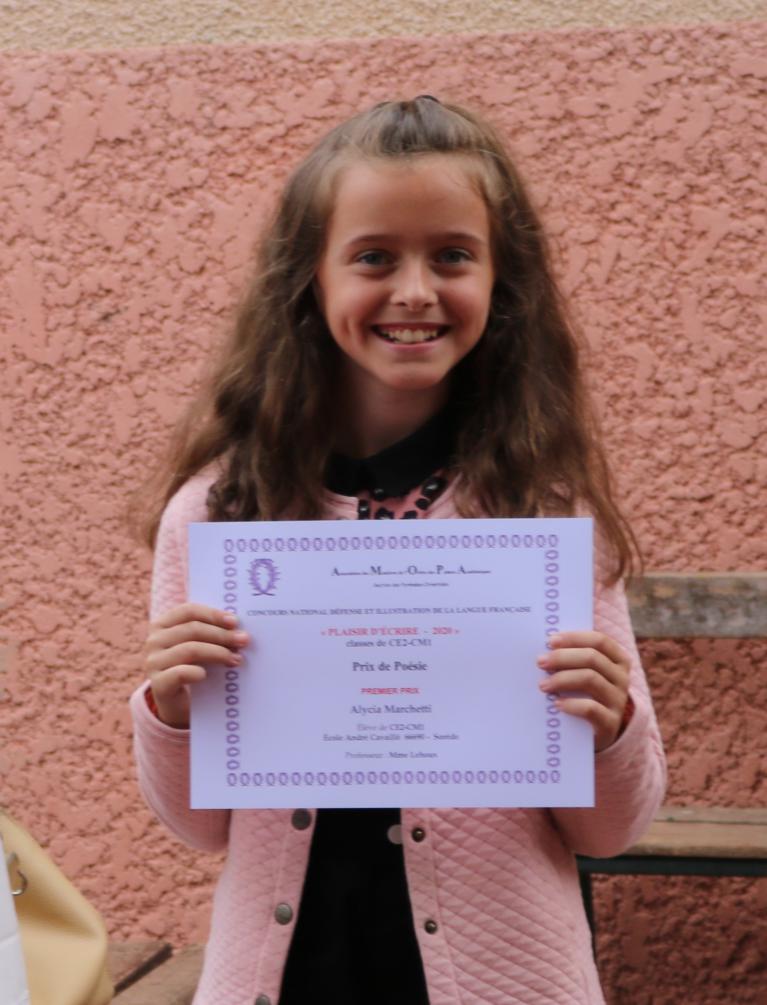 Un premier prix national de poésie pour Alycia Marchetti, élève de CM1 dans la classe de Madame Lehoux, pour le poème « Un rêve d'en-fant » et