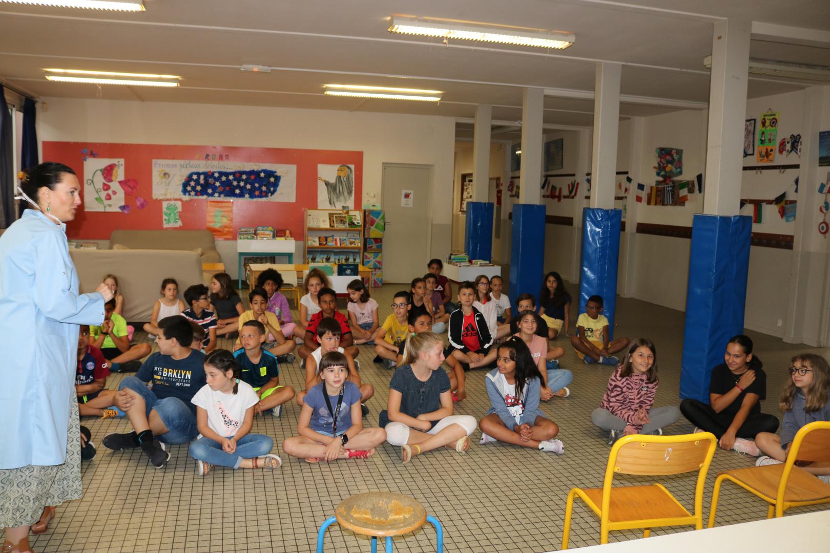 à sa gauche, MMe l'Inspectrice de secteur ; Mme Alsina, Directrice de l’école, la deuxième adulte à partir de la gauche.