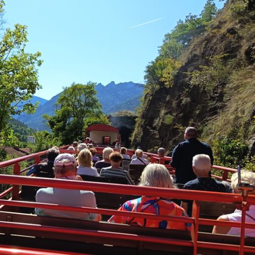 On l’appelle également le train du Pays Cathare et du Fenouillèdes. Le petit train rouge nous conduit de façon très folklorique , en wagon découvert par cette belle journée de fin d'été , de Rivesaltes à Axat en cheminant à 30 km à l’heure à travers le Fenouillèdes, ses vignoble réputés avec au loin le château de Quéribus .
