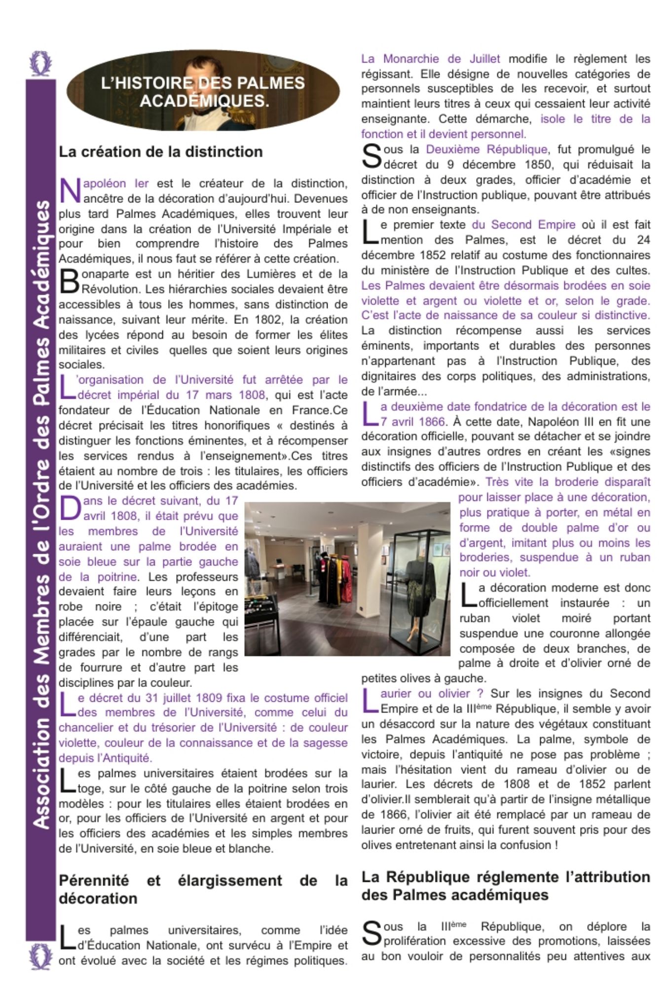 Les Palmes académiques, ont été instituées sous cette dénomination par Napoléon 1er en 1808 pour honorer les membres de l’Université (englobant alors les lycées) avec trois grades : les titulaires, les officiers de l’Université et les officiers des Académies.