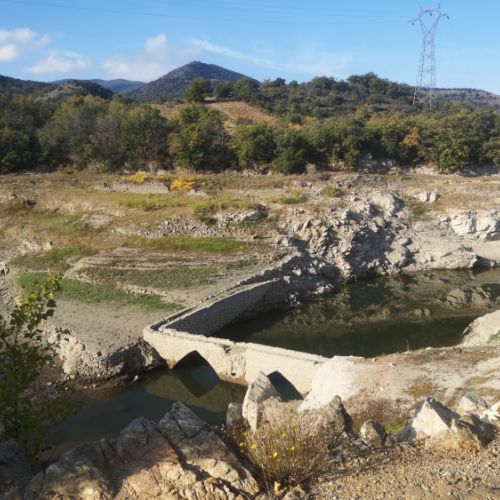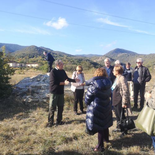 5 novembre 2025, le soleil « commandé » est bien présent. Bernard Caillens guette ses hôtes de l’AMOPA. Les voitures arrivent peu à peu au bas de la côte menant à Caramany, première halte face au cimetière, et tout près des plate-formes où furent découvertes les nécropoles anciennes, le long du fleuve Agly ; des marqueurs du Paléolithique, l’âge de la pierre taillée, ont été mis à jour, le paléolithique moyen se terminant 45000 ans avant notre ère...deuxième arrêt sur un petit plateau caillouteux, puis les tombes chrétiennes très anciennes sur sous un chemin menant à l’ancienne église Saint-Etienne de las Casas. Notre guide, maire de Caramany de 2014 à 2020, instituteur, puis maître formateur et directeur d’école, a grandi à Caramany dont il a exploré petit toutes les caches, tous les itinéraires, tous les ruisseaux, du château aux maisons serrées sur le roc. « Cara » = quern = rocher... « many » = magnus = grand…Comme son grand-père Clément, il a présidé aux destinées de la population du village, qui compta jusqu’à 577 habitants et n’a plus maintenant que 120 résidents permanents, et 150 résidences secondaires. Une école en RPI, avec 20 jeunes enfants cependant.